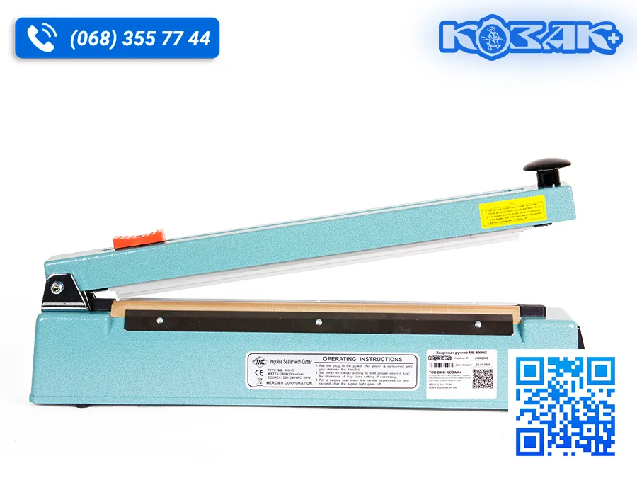 Електричний зварювач пакетів ME-400НC - ручний настільний зварювач полімерної плівки з механічною обрізкою. Зварювач призначений для зварювання пакетів та мішків (формування шва) з різних плівок - поліетиленової, поліпропіленової плівок, а також ламінованого паперу в процесі виготовлення різних виробів з термозварюваних матеріалів для пакування товарів.