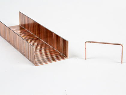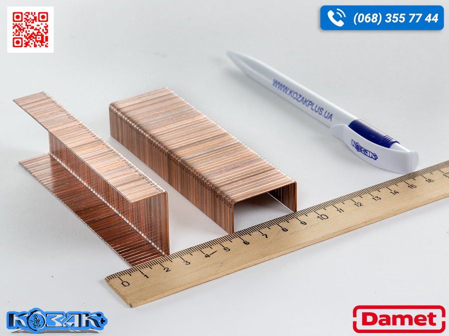 Скоба Damet 3518 виготовлена зі сталі, поверх якої гальванічним способом нанесений шар міді. Обміднення перешкоджає корозії пакувальної скоби під час експлуатації скріпленої нею гофротари.