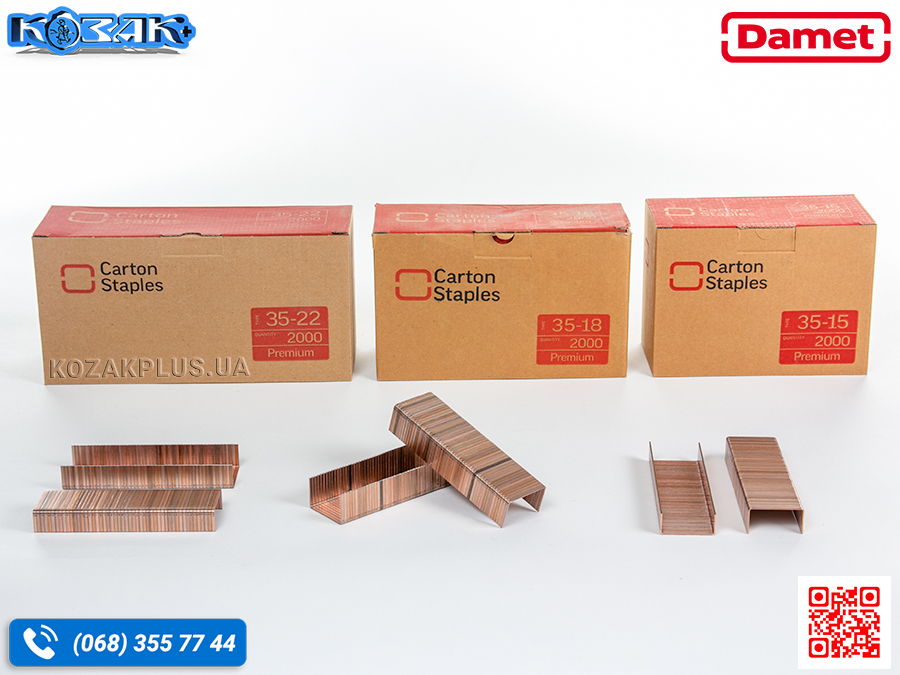 Скоба Damet 3522 виготовлена зі сталі, поверх якої гальванічним способом нанесений шар міді. Обміднення перешкоджає корозії пакувальної скоби під час експлуатації скріпленої нею гофротари.