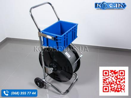 Диспенсер H-83 - це візок на колесах з посадковим місцем для бухти пакувальної поліпропіленової (ПП) стрічки й з ящиком для аксесуарів. Виробництво компанії Transpak Equipment Corp., Тайвань.