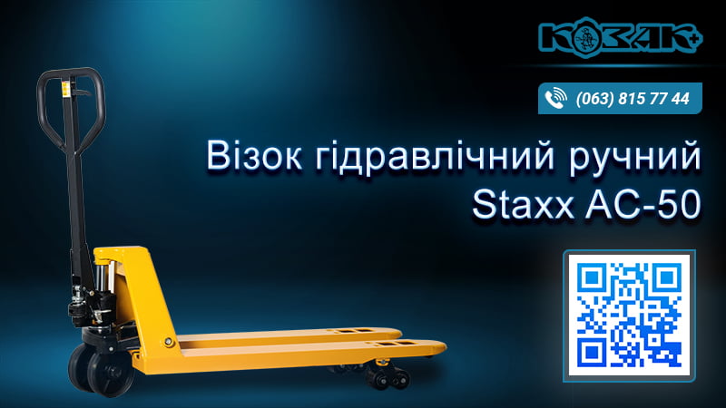 Візок гідравлічний Staxx AC50 - ручний вилочний підйомник, призначений для транспортування вантажів на палетах вагою до 5000 кг на будь-які відстані з мінімальною якістю підлогового покриття. Оптимально підходить для експлуатації в логістичних центрах, супермаркетах, складах і на підприємствах. Виробництво компанії Staxx, Китай.