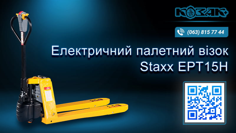 Ціна палетного візка EPT15H (Fast Charge) зазначена із ПДВ. Сервісний центр КОЗАК+ забезпечує гарантійне і післягарантійне обслуговування вантажопідйомної техніки Staxx.