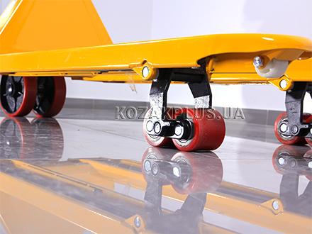 На кінцях вил гідравлічного візка встановлені по два додаткові ролики, що полегшують заїзд під палету й виїзд із під неї.