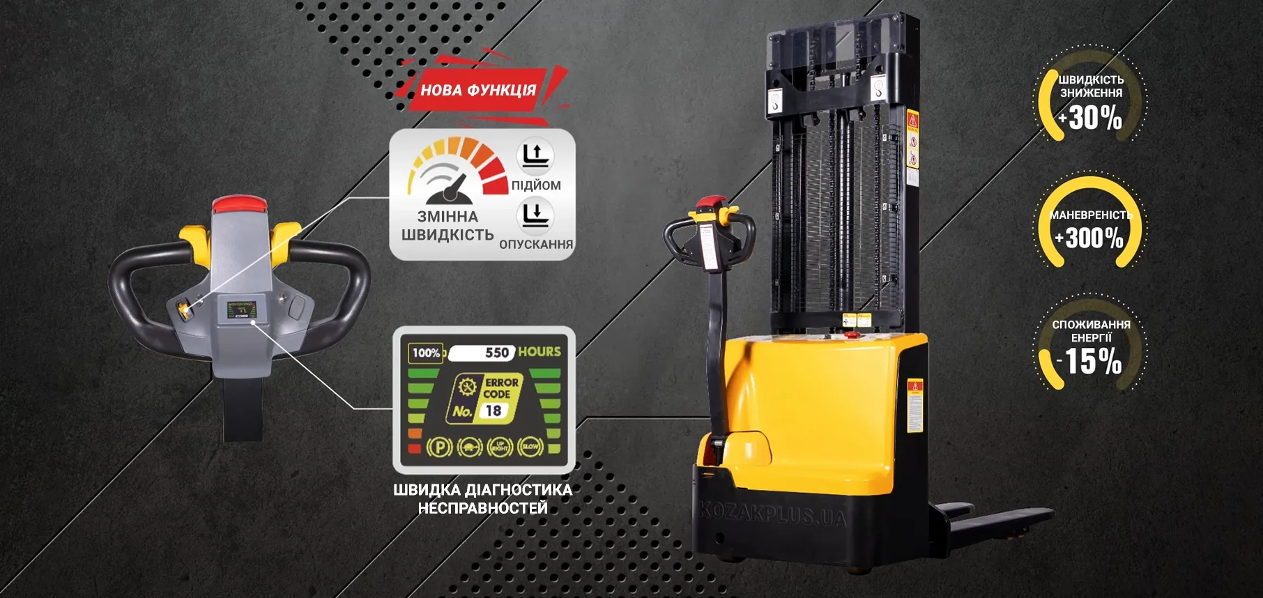 - Безпечне обмеження швидкості руху. Коли вила піднімаються вище 500мм, швидкість руху автоматично знижується до 2 км/год для безпеки у високому положенні у разі будь-якого збою.