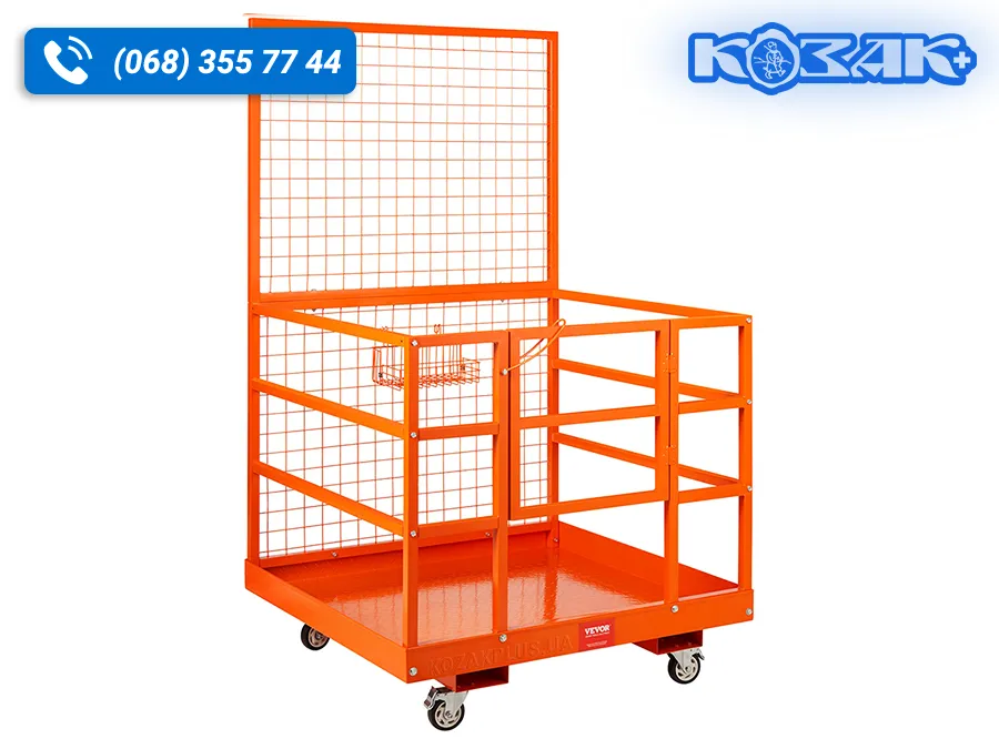 Платформа виготовлена з міцної сталевої конструкції з порошковим фарбуванням, оснащена захисними огорожами з металевої сітки, протиковзким піддоном і високою задньою спинкою для захисту оператора. Передбачені отвори для вил навантажувача та система фіксації до щогли, що забезпечує стабільність і безпеку під час роботи.