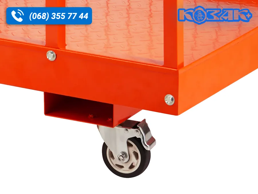 • Універсальні та поворотні колеса. Платформа оснащена чотирма міцними колесами, що дозволяють легко переміщувати її по території складу або виробничого приміщення без використання навантажувача.