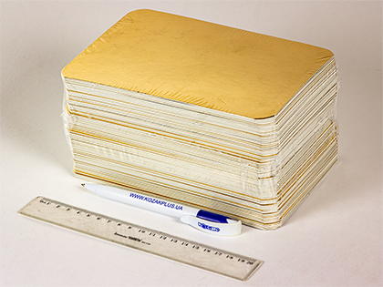 Ламінована підкладка золото-срібло 130 x 200 мм - вставка з ламінованого картону для вакуумних пакетів. Ламінований картон являє собою шар картону як основи, покритий зверху металізацією й плівкою із ПВХ або поліпропілену (ПП), що дозволяє підкладці, перебуваючи в агресивному середовищі не розмокати й зберігати первісний вигляд.