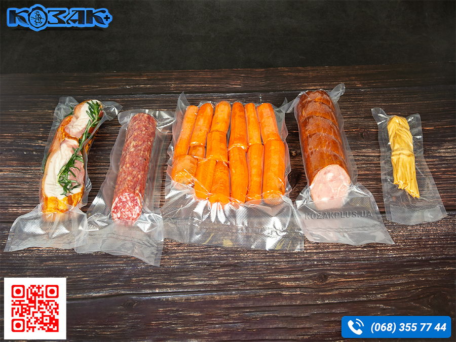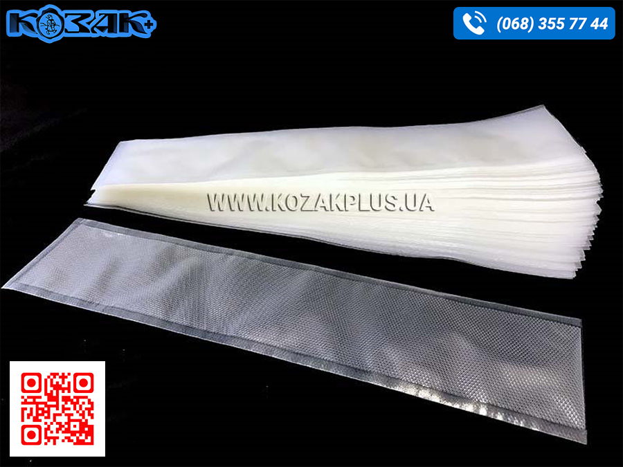 Тиснений вакуумний пакет PA/PE - прозорий рельєфний пакет з багатошарових полімерних матеріалів для пакування харчових продуктів за допомогою вакуумних машин. Виробництво компанії КОЗАК+, Україна.