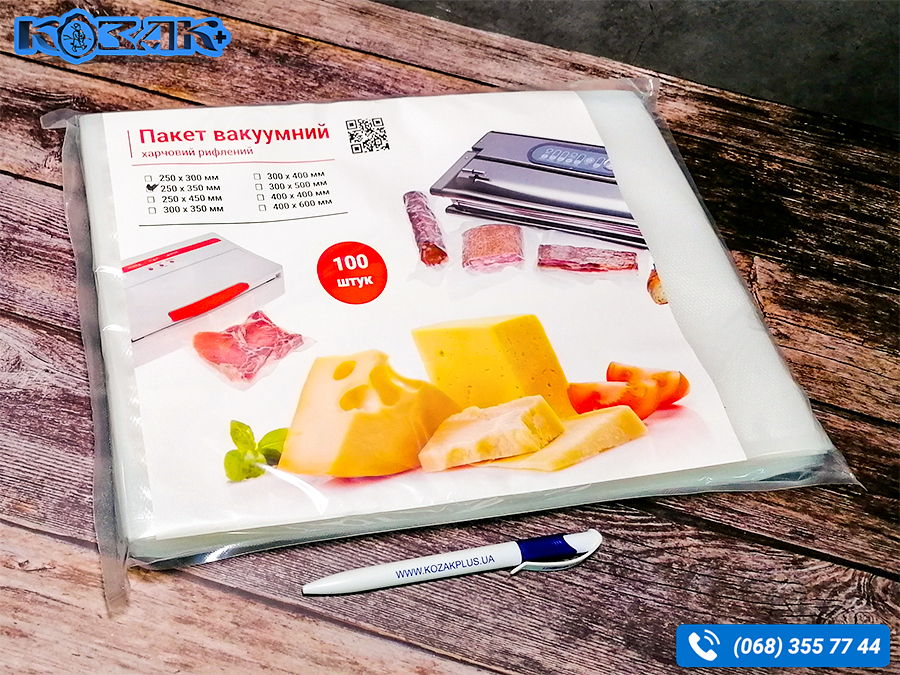 Тиснений вакуумний пакет PA/PE - прозорий рельєфний пакет з багатошарових полімерних матеріалів для пакування харчових продуктів за допомогою вакуумних машин. Виробництво компанії КОЗАК+, Україна.