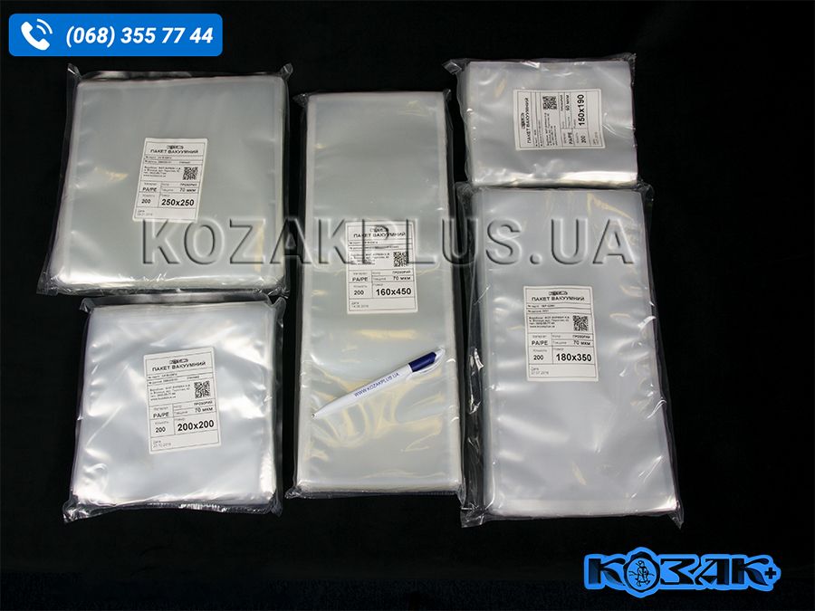 Пакет харчовий вакуумний - прозорий пакет з полімерних матеріалів для пакування харчових продуктів за допомогою вакуумних машин. Виробництво компанії КОЗАК+, Україна.