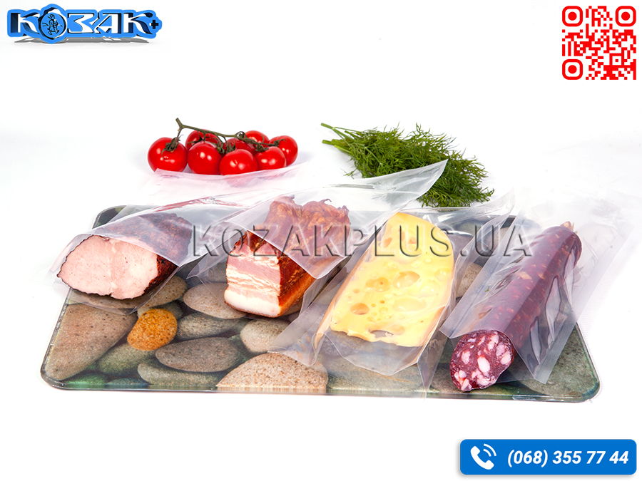 Пакет харчовий вакуумний - прозорий пакет з полімерних матеріалів для пакування харчових продуктів за допомогою вакуумних машин. Виробництво компанії КОЗАК+, Україна.