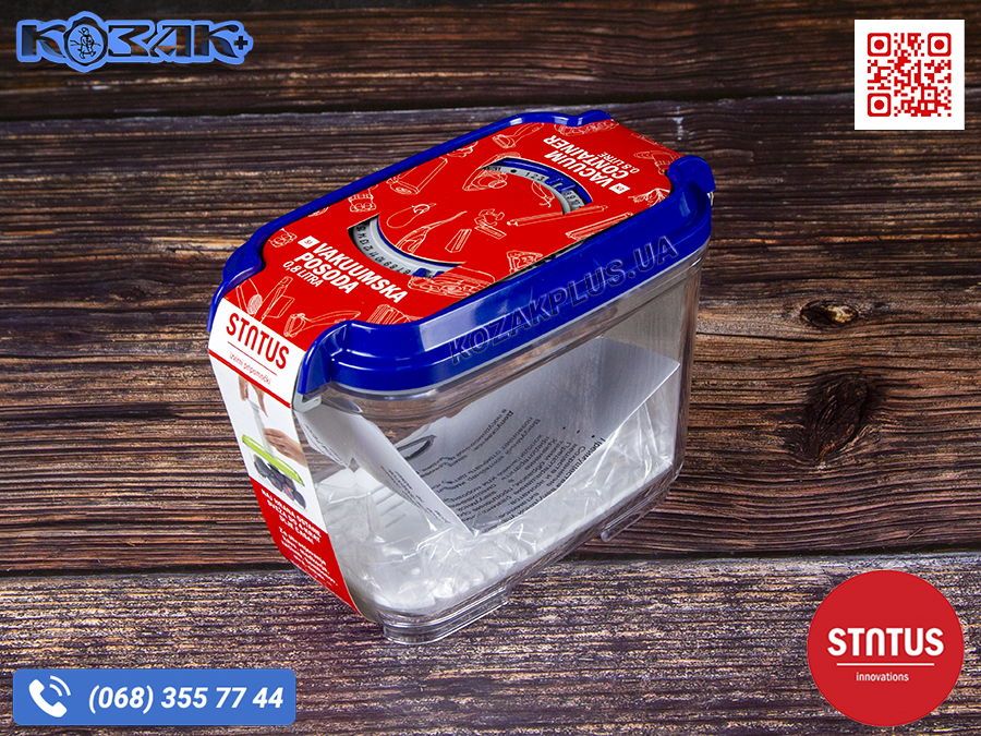 Вакуумний контейнер Status VAC-REC 08 - прямокутний прозорий контейнер з екологічного й міцного пластику нового покоління Tritan з кришкою, що герметично закривається для зберігання харчових продуктів у вакуумному середовищі. Виробництво компанії Status, Словенія.