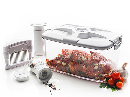 - При зберіганні у вакуумному контейнері STATUS замаринованого м'яса збільшується пористість продукту, що дозволяє маринаду набагато краще просочувати м'ясо. У результаті процес маринування значно скорочується, а смак м'яса стає ще краще