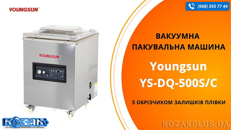 Вакуумний пакувальник YS DQ 500S/C - підлогова напівавтоматична вакуумна машина з відрізним ножем, яка призначена для пакування харчових продуктів або промислових товарів у безповітряне (вакуумне) середовище та відрізання залишків пакета. Виробництво компанії Youngsun, Китай.